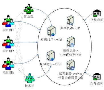 實(shí)訓(xùn)支撐環(huán)境主要由知識(shí)管理工具(Wiki/BBS)、資源共享工具(FTP)和團(tuán)隊(duì)軟件生產(chǎn)協(xié)作工具(svn/jira/database)等構(gòu)成。FTP實(shí)現(xiàn)資源的積累,Wiki編織各種資源形成知識(shí)門(mén)戶(hù)。利用Wiki建立項(xiàng)目指導(dǎo)網(wǎng)站,描述了項(xiàng)目背景、業(yè)務(wù)要求、項(xiàng)目里程碑、關(guān)鍵制品及生產(chǎn)指南、技術(shù)培訓(xùn)資料等。在項(xiàng)目中,發(fā)布團(tuán)隊(duì)在管理、分析與設(shè)計(jì)中產(chǎn)生的最佳實(shí)踐,促進(jìn)知識(shí)傳播。