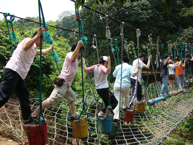 一路歡歌笑語很快就到了笑翻天。我們的教練很年輕,但非常威嚴(yán),在教練的帶領(lǐng)下,三個團(tuán)隊(duì)從最初的破冰訓(xùn)練到出色的完成了天羅地網(wǎng)、突出重圍、空中鋼絲、踏籠飛渡等項(xiàng)目,并以卓越的團(tuán)隊(duì)協(xié)作能力和對同事的信任以21人的成績出色完成了“孤島求生”這個項(xiàng)目。
