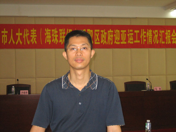 2010年7月13日上午,海珠區(qū)人大常委委員周小聰出席在海珠區(qū)政府會議中心舉行的廣州市人大代表聽取區(qū)政府迎亞運工作情況匯報會,并實地視察了亞運會部分比賽場館在我區(qū)的安全及保障工作。 出席大會的領(lǐng)導(dǎo)有市人大常委會副主任潘慶櫧、海珠區(qū)委書記鄧偉強、區(qū)人大副主任馮舶等。