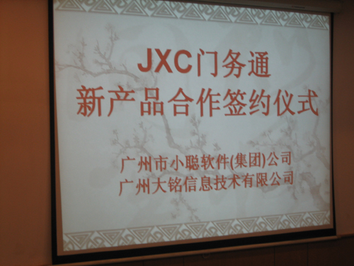 小聰公司一直致力于3W行業(yè)軟件的研發(fā),已開發(fā)出3W 18個行業(yè)30多款軟件產(chǎn)品,客戶遍布全國各地,廣州大銘信息技術有限公司是一家專業(yè)從事“門務通”系列軟件研究的公司,小聰軟件與大銘信息雙方強強合作,優(yōu)勢互補,簽定了“JXC門務通”合作開發(fā)協(xié)議。