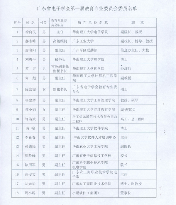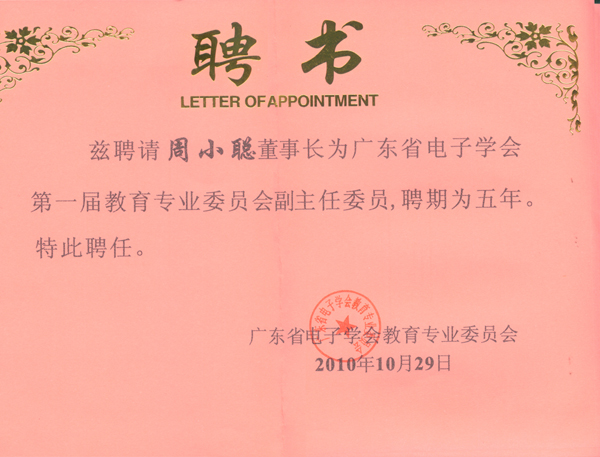 廣東省電子學(xué)會第一屆教育專業(yè)委員會于2010年10月29日在華南農(nóng)業(yè)大學(xué)舉行, 會議宣讀了第一屆理事會成員名單并頒發(fā)了聘書。華南理工大學(xué)電信學(xué)院副院長徐向民任第一屆主任委員,其中小聰軟件集團(tuán)董事長周小聰任第一屆副主任委員。 教育專業(yè)委員會將以“服務(wù)會員、服務(wù)行業(yè)、服務(wù)教育、服務(wù)社會”為宗旨,致力于開展國內(nèi)外電子信息教育科學(xué)研究,教學(xué)改革實(shí)驗(yàn)和學(xué)術(shù)交流與合作,為電子信息領(lǐng)域教育決策提供科學(xué)分析、信息反饋和咨詢意見,推動廣東省電子信息行業(yè)快速健康發(fā)展。