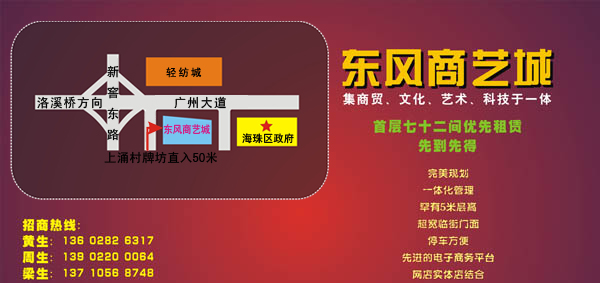 東風(fēng)商藝城: 是在海珠區(qū)政府支持下,由廣東省著名企業(yè)集團和東風(fēng)經(jīng)濟聯(lián)合社共同建設(shè),位于廣州大道西約南大街三號廣東軟件小聰創(chuàng)意園一層(上沖牌坊直入50米,一期建筑面積6000多平方),集商貿(mào)、文化、藝術(shù)、科技于一體的綜合性商藝社區(qū),歡迎網(wǎng)購實體店優(yōu)先進(jìn)駐,優(yōu)先支持大學(xué)生創(chuàng)新創(chuàng)業(yè)。