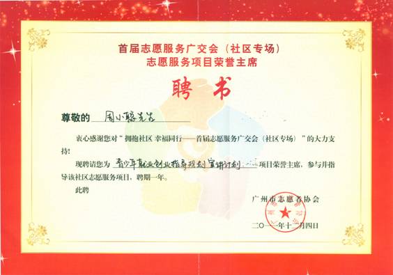 2011年12月4日,在首屆志愿服務(wù)廣交會(huì)上,廣州市志愿者協(xié)會(huì)為小聰軟件董事長(zhǎng)周小聰先生頒發(fā)了志愿服務(wù)項(xiàng)目榮譽(yù)主席聘書,聘請(qǐng)周小聰為“青少年就業(yè)指導(dǎo)規(guī)劃宣講計(jì)劃”項(xiàng)目榮譽(yù)主席,參與并指導(dǎo)該志愿服務(wù)項(xiàng)目。