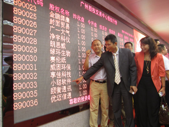 2012年8月9日上午,廣州股權(quán)交易中心正式掛牌開業(yè)。廣州股權(quán)交易中心位于廣州金融創(chuàng)新服務(wù)區(qū)羅崗科技園,地址:廣州市羅崗區(qū)科學(xué)大道241-245號(hào)A4-A6棟附樓一層。小聰軟件經(jīng)海珠區(qū)政府推薦,有幸成為廣州新三板(OTC)首批上市企業(yè)之一,上市代碼為880013。 廣東省副省長(zhǎng)陳云賢、廣州副市長(zhǎng)歐陽(yáng)衛(wèi)民、廣州市委常委凌偉憲、廣州市人大常委會(huì)主任張桂芳、廣東省證監(jiān)局局長(zhǎng)侯外林、廣東銀監(jiān)局副局長(zhǎng)等領(lǐng)導(dǎo)出席了本次掛牌儀式。另外,參加掛牌儀式的還有省有關(guān)領(lǐng)導(dǎo)同志,各地級(jí)市市委、市政府的主要負(fù)責(zé)同志以及省直有關(guān)機(jī)關(guān)、中央駐粵金融監(jiān)管部門和中央駐粵金融企業(yè)的負(fù)責(zé) 同志以及部分地方金融機(jī)構(gòu)的負(fù)責(zé)同志。