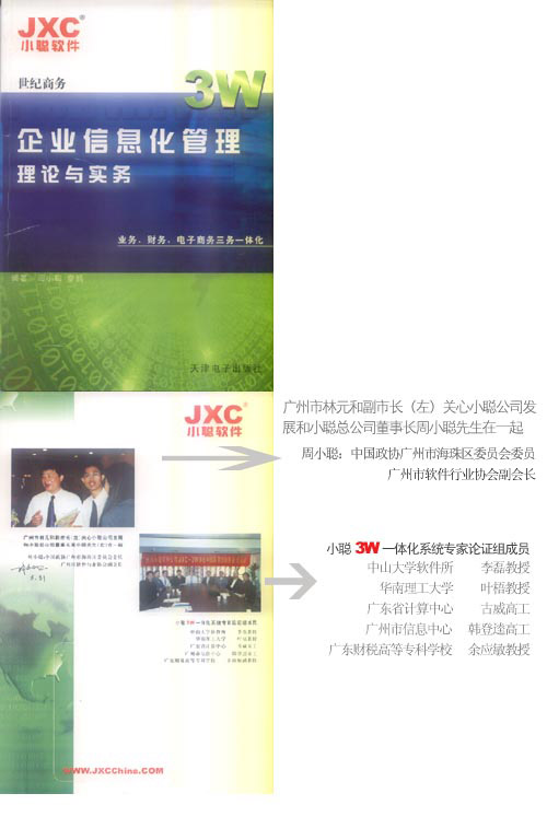 《企業(yè)信息化管理理論與實(shí)務(wù)2003》一書在廣州市海珠區(qū)科技局、廣州市科技局、廣州市副市長(zhǎng)林元和同志等各級(jí)領(lǐng)導(dǎo)關(guān)懷和支持下,2003年新版由天津電子出版社出版了。這是繼“小聰3W一體化系軟件”榮獲廣州市2002年科技獎(jiǎng)后又一喜訊。 本書是一本企業(yè)信息化管理理論性與實(shí)際性完美結(jié)合的實(shí)用型教科書,也可以作為實(shí)際用戶手冊(cè)。本書光盤內(nèi)容適用于計(jì)算機(jī)應(yīng)用學(xué),企業(yè)管理學(xué),會(huì)計(jì)學(xué)和信息管理學(xué)專業(yè)的老師、學(xué)生,自學(xué)者和企管工作者,軟件用戶以及從事商務(wù)軟件開發(fā)的系統(tǒng)分析人員、程序員,還有計(jì)算機(jī)管理學(xué)的理論研究人員,作為操作手冊(cè)和參考研究素材。 本書由周小聰、廖鵬主編,李凱強(qiáng)、申鋒、何巧茹、李學(xué)明、周思敏、余沐生、朱小明、譚延慧、夏艷、陳漢強(qiáng)、林建鋒、區(qū)釗強(qiáng)、梁志廣、包傳康、周美初、梁四根、杜宏霞 、施鴻卯等人在編寫過(guò)程中付出了辛勤的勞動(dòng),得到中山大學(xué)嶺南學(xué)院及計(jì)算機(jī)研究所等專家教授的指導(dǎo),同時(shí)還得到廣州市科技局馬小明女士、《電腦報(bào)》天極公司副總裁楊濤先生、美國(guó)國(guó)際大學(xué)(AWU)林國(guó)華先生的指導(dǎo)和幫助,在此一并致謝。 本書價(jià)格68元,隨書附學(xué)習(xí)光盤,歡迎購(gòu)買,也可直接向本公司郵購(gòu)。