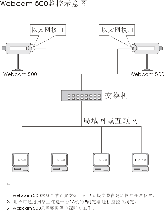 | 網(wǎng)眼WEBCAM 應(yīng)用原理圖 使用簡單: webcam 只需要提供電源即可工作,接入網(wǎng)線(RG45接口)即可連通。 在遠(yuǎn)端采用PC顯示器通過IE或Netscape即可觀看監(jiān)視畫面,而不需要借助可安裝任何其它軟件。